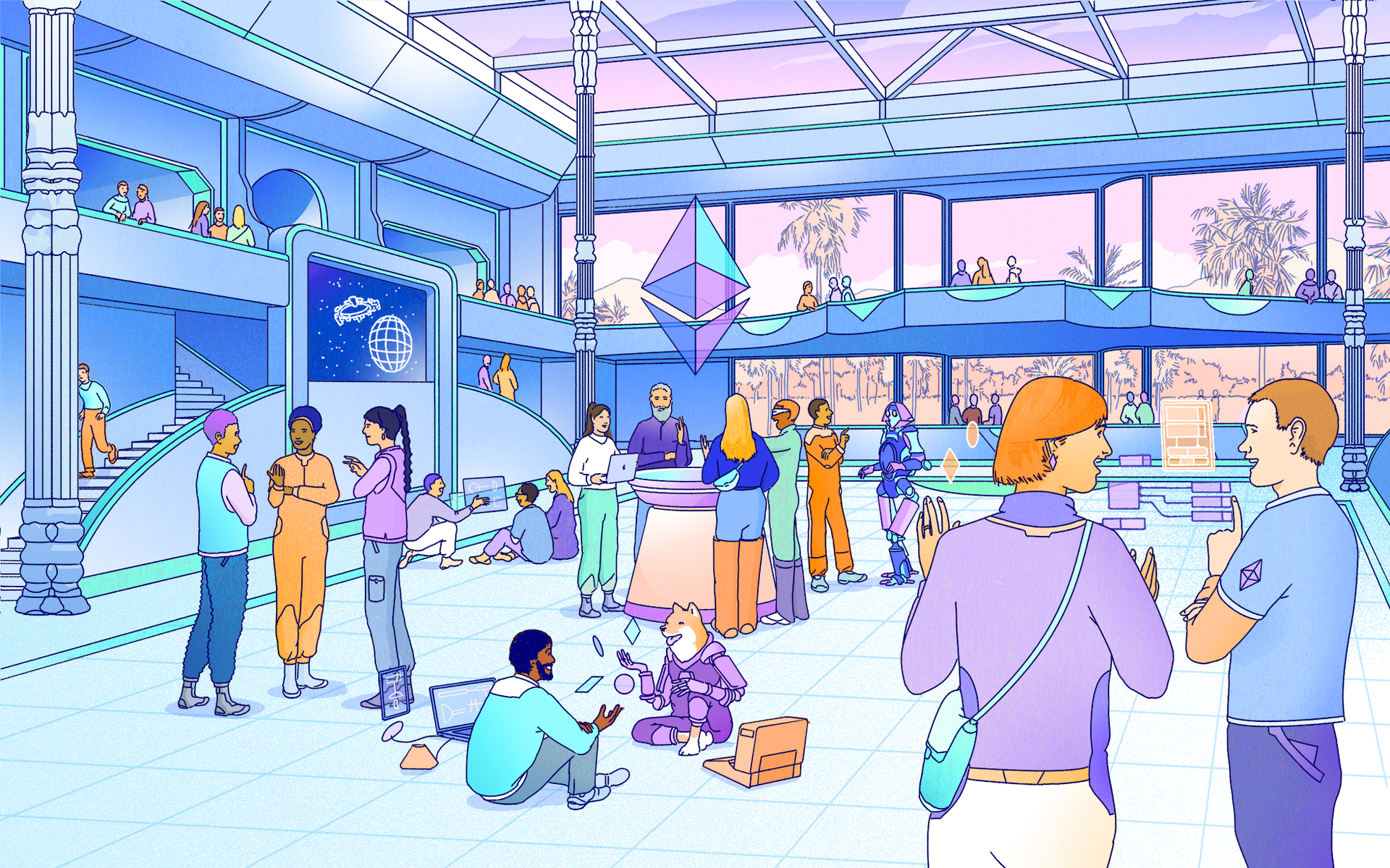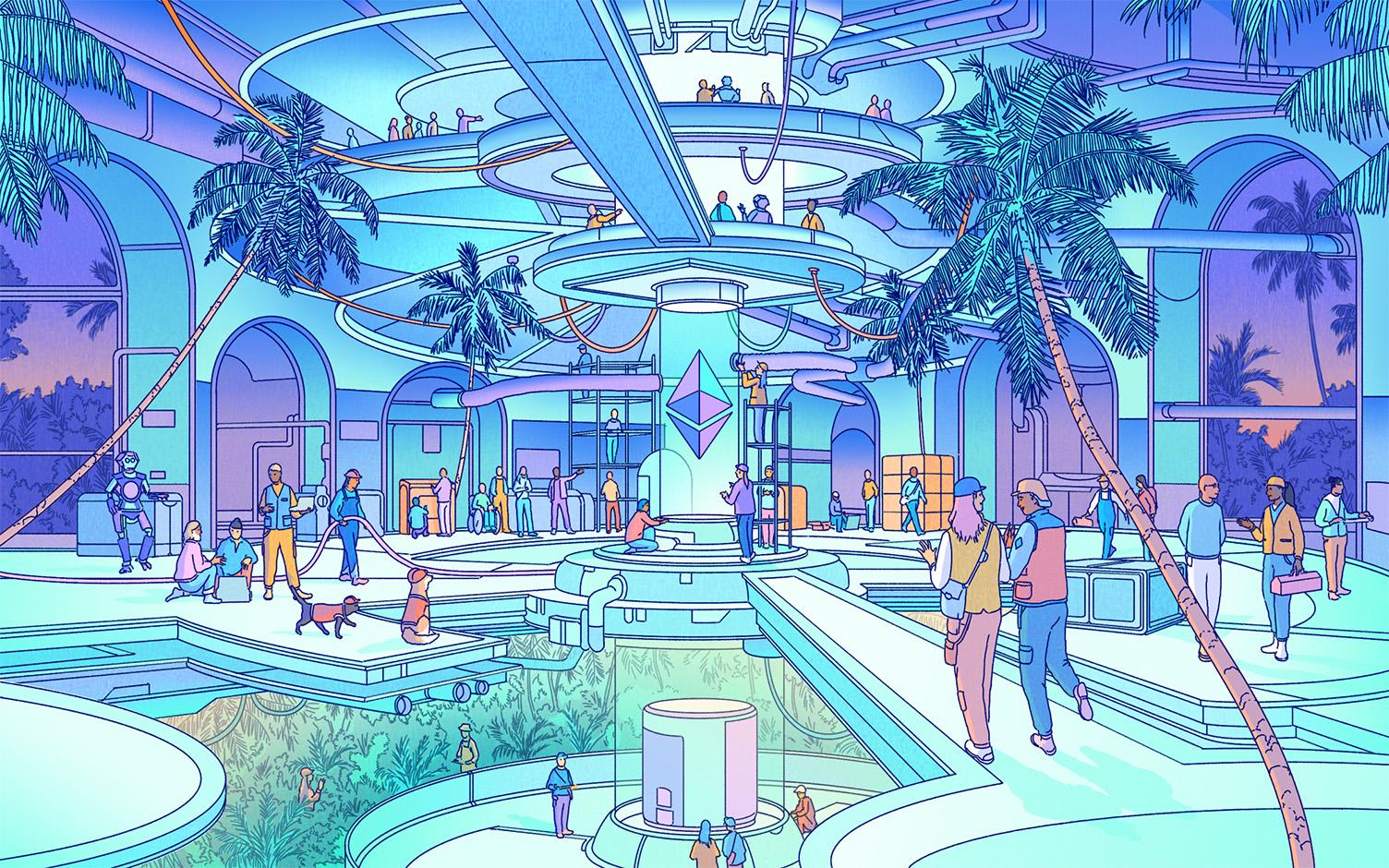 An illustration of a futuristic city, representing the Ethereum ecosystem.